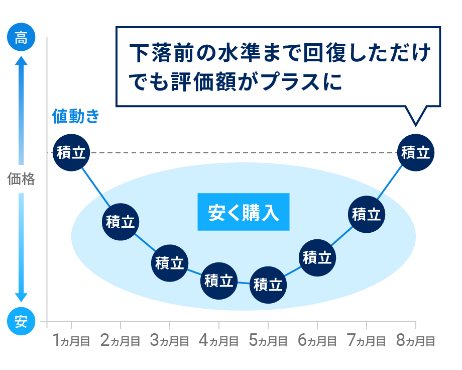 相場下落時に積立投資を続ければ、相場が回復した際に恩恵を受けられる