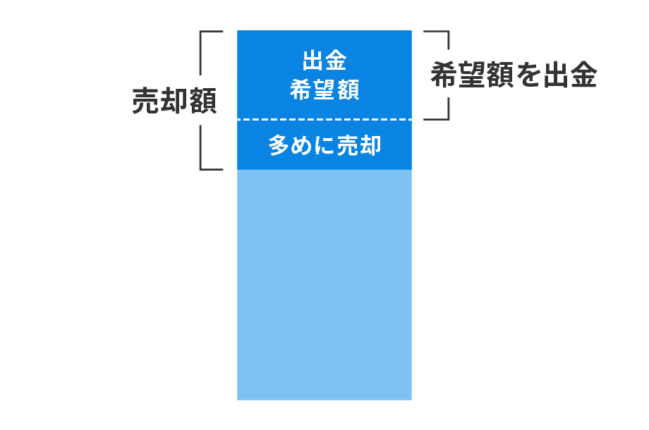 一部を出金するケースでは、お客様の出金希望額をもとに、ETFの売却を行います。その際、売却するETFの銘柄や数量は、ポートフォリオのバランスを整えるように自動で決定されます。なお、相場の変動により価格が大きく下落したとしても出金希望額を用意できるよう、多めに売却を行います。