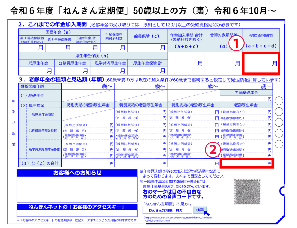 特に注目したいのは裏面の右上の「①受給資格期間」とその下の「②老齢年金の種類と見込額(年額)」です。