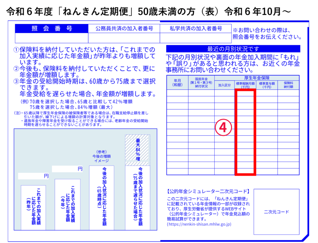 特に注意して見ておきたいポイントは、裏面の下部の「③これまでの加入実績に応じた年金額(年額)」と、表面の「④標準報酬月額」です。