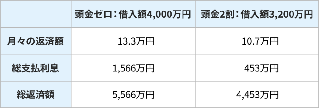 頭金を多く準備するほど、住宅ローンの借り入れ額を抑えることができるため、総支払利息が少なく済みます。例えば4,000万円の家を買って全期間固定金利型(金利2%・35年ローン・元利均等返済方式)で借りる場合は、以下の通りです。